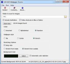 Keywords: wallpaper, wallpaper rotator, images, desktop, startup 100dof Wallpaper Rotator is a simple program that can be used to rotate Windows Desktop Wallpapers from a user defined folder and/or sub-folders. Wallpaper Rotator is ideal to be run on system startup. It consumes no memory or other system resources since it does not stay resident (just changes the wallpaper and then exits). A handy feature of 100dof wallpaper rotator is that it can also follow windows shortcuts to directories and image files. That is, you can create a folder that contains shortcuts to your favorite images or shortcuts to entire folders with images and setup 100dof wallpaper rotator read images from this folder.