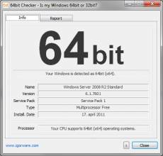Company: IgorWare Country: Serbia, Belgrade ASP member: No Company Web site: http://www.igorware.com Application info: http://www.igorware.com/64bit-checker Author: IgorWare Support Sales email: support@igorware.com Support email: support@igorware.com License type: Freeware Class: System Utilities::Other Specific: Utilities Categories: Platform: Windows OS: Win2000, WinXP, Win7 x32, Win7 x64, Windows 8, Windows 10, WinServer, WinOther, WinVista, WinVista x64 System requirements: Windows Language: English Limitations: