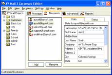 Keywords: email, bulk email, mass email, email list Customizable emailing software used by government, universities and businesses around the world. Easy and versatile import from Outlook, Netscape, Mozilla, Thunderbird, Eudora, ODBC, SQL, Exel, Access etc, ability to send directly from external data sources, automatic removal of duplicate addresses, fast multithreaded email address verification, text or HTML messages, built-in HTML editor, HTML templates, mail merge, spell checker, active scripting, real time preview, flexible sending, scheduling, subscription forms, automatic letters to new subscribers, automatic bounce processing, click through detection, targeted follow-ups, advanced mailing list management, data export, companion server software and more...Three different editions to fit your needs and budget.