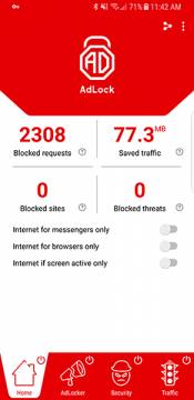 - With our ad stopper, you will get rid of ads no matter what you are using Skype, Viber or Google Chrome. - With the help of our ad remover for Android, you will save your mobile data and bandwidths as its firewall features can block unwanted internet access to different applications. - Every time, you try to reach a suspicious website, AdLock will first check its URL to find out whether it contains malicious software, and if so, youll get a warning pop up. - AdLock filters HTTPS connections. - Our ad blocker for Android apps and browsers provides regular reports with the number of deleted threats and amount of saved traffic.