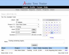 Keywords: время, рабочее время, рабочие часы, трекинг времени, учет времени, учёт времени, учет рабочего времени, учёт рабочего времени, счёт-фактура, счет-фактура, табель, отчет, расходы, учет расходов Anuko Time Tracker - это простая и удобная в использовании система учета рабочего времени с открытым исходным кодом (PHP). Позволяет отслеживать время в трёх режимах: только время, время по проектам, или по проектам и задачам. Имеет систему отчётов. Позволяет создавать счета-фактуры. Имеет следующие роли для доступа: обычный пользователь, менеджер, и ассистент менеджера. Пользователи группируются в команды по 1-й на предприятие или фирму, где менеджер и ассистенты имеют больше прав, например могут создавать новые проекты, редактировать почасовые ставки оплаты и т.п. Можно подключать следующие плагины для дополнительной функциональности: диаграммы - для просмотра процентного соотношения рабочего времени, клиенты - для привязки времени к заказчикам, счета-фактуры - для биллинга заказчиков, дополнительные поля - для ассоциации дополнительной информации с записями о рабочем времени, расходы - для учета расходов. Бесплатный хостинг есть на https://timetracker.anuko.com на многих языках, в том числе на русском.