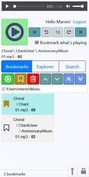 Keywords: Windows audio website, audio browser, Audio Web browser, play mp3 files browser ** AudioWeb is a personal audio website for Windows. ** AudioWeb creates a website (without IIS!) on your computer allowing you to play your mp3 audio files through any web browser! ** AudioWeb excels at playing sequential audio files, such as in an audio book or podcast. Of course, AudioWeb can also play your music files. ** You can easily browse, play and bookmark audio files using any modern web browser. AudioWeb will work on most browsers on any iPad, iPhone, Android phone or tablet, or on a Windows or Mac desktop. AudioWeb looks great on an 8' iPhone! ** There is no complicated Windows IIS (Internet Information Services) setup involved! (AudioWeb does not even use IIS.) All the details of creating and running a website are handled transparently inside AudioWeb for you. All you have to do is run AudioWeb on your Windows computer, create a user, then log in through any web browser. It just works! ** Create any number of separate users, each with his/her own bookmarks and settings. ** AudioWeb never loses your place in a book, even if you log out. When you log in again (even from a browser on another device), it will resume play exactly where you left off. ** You can use AudioWeb within your local router only if desired, or open a router port to play your audio from anywhere on the internet. ** AudioWeb is a natural complement to PodSilo by MollieSoft, which downloads podcasts for you. Use AudioWeb to play your podcasts through any web browser. ** Show book images and notes (created manually by user) on the web page when a book is played. ** Try AudioWeb free for 60 days! ** Runs on Windows 8.1 or Windows 10.