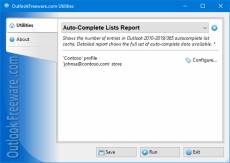 Keywords: free, freeware, outlook, add-in, add-on, autocomplete, reports This free tool reports the number of entries in Outlook 2010/2013/2016 autocomplete list cache. Detailed report shows the full set of auto-complete data available. Even if all Outlook contacts are lost or an angry employee deleted a customer base, there is another way to restore important contacts. Every time you send a message, Outlook stores selected recipients in Auto-Complete Lists and keeps them there, until they are deleted manually. These data are not available anywhere else, and many users are unaware this is not the Outlook contacts, but individual data. This report shows the number of contacts in AutoComplete lists for all connected mailboxes and accounts in Outlook 2010 and above. In advanced mode, the report shows all contacts for each account in your Outlook profile: name, email address (including X.500), and other fields. The creation of this report is the easiest way to save all the information from the Auto-Complete Lists to a CSV file. The result is a ready-made contact list you can open in Excel, edit, and import back into Outlook contacts. This is an easy way to restore contacts with email addresses from AutoComplete Lists in case of loss of the contact list. The utility can be useful in investigations and security audits. Auto-Complete Lists are stored inside the mailboxes, and there are no standard Outlook tools for viewing or editing them. Even if users delete all messages and contacts, they often forget about Auto-Complete Lists, which clearly shows recent recipients. If you don't want to leave any contacts on the computer, run this report, and make sure you haven't forgotten to delete anything. Command line allows you to export Auto-Complete Lists from PST data files and mailboxes of other users in bulk.