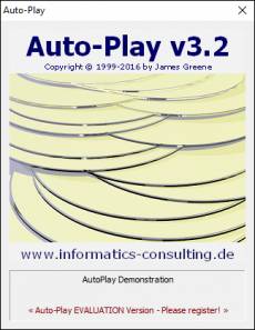Company: Greene Informatics Consulting Country: Germany, Baden-Württemberg, Schliengen ASP member: Yes Company Web site: http://www.informatics-consulting.de Site of program: http://www.informatics-consulting.de/ Application info: http://www.informatics-consulting.de/software/autoplay.htm Author: James Greene Sales email: greene@informatics-consulting.de Support email: greene@informatics-consulting.de License type: Shareware Class: Audio & Multimedia::Other Specific: Categories: Utilities :: Launchers Platform: Windows OS: Win2000, WinXP, Win7 x32, Win7 x64, Windows 8, Windows 10, WinServer, WinOther, WinVista, WinVista x64 System requirements: Windows XP, 32-bit Language: English Limitations: Extended functionality disabled, but the Shareware version is suitable to demonstrate the product's usefulness.