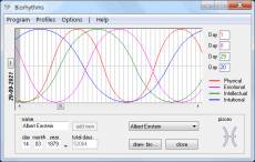 Keywords: Biorhythm, Cycles, Health, Birthday, Physical, Emotional, Intellectual, Intuitional, Date, Brain, Life Biorhythm: draws your own personal biorhythm cycle charts each day, helping you react and understand. Includes Physical, Emotional, Intellectual and Intuitional cycles. You can add as many people to the software's database as you want and draw each biorhythm chart for each individual person at will. The Biorhythm theory is based on the idea that our daily lives are significantly affected by rhythmic cycles with periods of exactly 23, 28 and 33 days, typically a 23-day physical cycle, a 28-day emotional cycle, and a 33-day intellectual cycle.