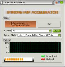 Keywords: BitRope P2P Accelerator, p2p universal accelerator, file sharing booster, p2p universal booster, universal download accelerator, download booster, Limewire accelerator, uTorrent accelerator, BitTorrent accelerator BitRope P2P Accelerator is a highly-developed file sharing add-on to complement the performance of the program you use to download torrents. The first aspect of the convenience around which it is built is rendered by the level of compatibility it offers - BitRope P2P Accelerator works very well with all p2p clients that come to your mind including uTorrent, Azureus, Ares, Bearshare, BitTorrent, BearFlix, BitComet, DC++, Emule, Edonkey, FrostWire, Imesh, Kazaa, LimeWire, Morpheus, Shareaza, Warez, WinMx etc. If you download content more than occasionally then a file sharing accelerator is indispensable to your p2p experience. BitRope P2P Accelerator is one of the most reliable universal accelerators available free of charge. It ensure that your torrents are downloaded at the highest speed that your internet connection, the number of download sources (which will also be increased), and the bandwidth you have available (which will be also optimized) allow. BitRope P2P Accelerator includes a number of advanced features able to maximize the behavior of your BitTorrent client without calling for your technical skills. From installing to running the program and boosting your torrents downloads, the user-friendliness remains probably the key feature of BitRope P2P Accelerator - so loyal to the concept that you could actually teach a six year-old (or your grandma, for that matter) to use it. This is mainly due to it being designed to perfectly integrate into the p2p client you are using and operate automatically without the user's intervention. Another strong point of the program is its size - BitRope P2P Accelerator is very content with very little resource consumption which also makes it a good choice.