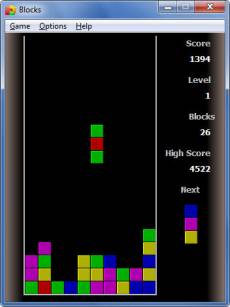 Keywords: blocks, game, puzzle, tetris Throughout the Blocks game piece of three blocks of various colors fall from the top to the bottom of the playing area. When the blocks form a solid row of three or more similar blocks across the playing area, that row vanishes. Because this is the only way to remove blocks, you should try to form solid rows whenever possible. The game ends when the pieces stack up to the top of the playing area. You can manipulate a piece only when it is falling. Falling blocks may be swapped, moved horizontally, or dropped to the bottom of the playing area. The object of Blocks is to continue playing for as long as possible. The game is over when the playing area is stacked to the top with blocks.