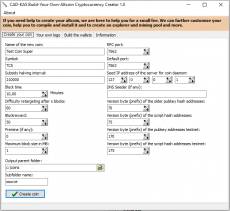 Keywords: Altcoin, cryptocurrency, Bitcoin, fork, coin, coin generator, altcoin creator You want to build your own cryptocurrencies but you do not know where to start? With Build-Your-Own-Altcoin Cryptocurrency Creator you can create your altcoins with a few mouse clicks. You save at least a few hours or even days of work even if you are a developer. If you are not a developer you can start your own altcoin without the need to change any program code. If you need further help in the creation of your altcoin you can contact us and we will help you. You can customize many things in the program. The program uses the Bitcoin v0.17.1 source code as a basis. You can customize the following things: name, symbol, block time, difficulty retargeting interval, subsidy halfing interval, block reward, premine, maximum block size, ports, seed ip, dnsseeder, address version bytes. You can replace the pictures in two of the folders to use your own logo for the coin. You can compile the coin on your own, which is not very hard, only a few lines of code to copy and paste. But if you need help with that step, we offer this as a service for a small fee too. We also offer to help you with all other steps like creating an explorer, mining pool, dnsseeder etc. for a small fee. We are not responsible for any loss of funds or any damage due to errors in the program source code. This program uses the Bitcoin source code as a basis which is open source.