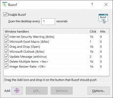 Keywords: Basta, Buzof, automatically, close, dialogs, messages, push, buttons, press, minimize, windows, boxes, prompts, automation, repeat, click, suppress, eliminate, recurrent, nags, scan, freeze, hang, error, annoying, desktop, enhancement, utility, utilities, tools, shareware Annoyed by the repeated assaults of spurious messages and confirmation prompts on your desktop? Would you like to get rid of Internet cookies or pesky Are you sure you want to do this or that questions? Don't let these or any other windows stress you, interfere with your productivity, or freeze your computer while you are away. Get rid of them with Buzof! Buzof enables you to automatically answer, close or minimize virtually any recurring window including messages, prompts, and dialog boxes. Simply teach Buzof how to click the button that you would normally click to get rid of the annoying window. From this point on, Buzof will periodically scan the desktop and take care of the window whenever it shows up again. Teaching Buzof how to click buttons is a snap; it can be done either by dragging an icon from the Buzof window to the targeted button, or by positioning the cursor over the button and pressing a hot key. Buzof is designed to handle many different situations that would otherwise need to be addressed individually by specialized software. In fact, Buzof handles all kinds of messages and dialog boxes so well that many users think that it was designed for their specific needs. Moreover, Buzof will continue to be useful even after upgrading your other software. For example, when browsers started to include a feature to disable cookies, specialized cookie elimination software became useless. But Buzof continues to help you by handling other annoying prompts, including new ones that you may encounter when you buy new software or upgrade your existing applications. Stop wasting time with unsolicited messages that invade your desktop out of nowhere. Get Buzof!