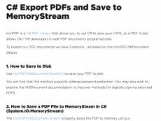 Company: C# Export PDFs and Save to MemoryStream Country: United States of America, Colorado, Aurora ASP member: No Company Web site: https://ironpdf.com/docs/questions/export-save-pdf-csharp/ Site of program: https://ironpdf.com/docs/questions/export-save-pdf-csharp/ Application info: https://ironpdf.com/docs/questions/export-save-pdf-csharp/ Author: Jonah Williams Sales email: csharpexportandsavepdf.pad@submitpad.org Support email: csharpexportandsavepdf.pad@submitpad.org License type: Shareware Class: Development::C / C++ / C# Specific: Categories: Business & Finance :: Accounting Tools, Business & Finance :: Calculators & Converters, Business & Finance :: Database Managers, Business & Finance :: Fax Tools, Business & Finance :: Inventory, Business & Finance :: Invoice & billing, Business & Finance :: Office Tools, Business & Finance :: PIMS & Organizers, Business & Finance :: Project Management, Business & Finance :: Stocks & Portfolios, Business & Finance :: Taxes, Business & Finance :: Finance Tools, Business & Finance :: Payroll, Business & Finance :: Spreadsheets, Business & Finance :: Utilities, Games :: Action, Business & Finance :: Word Processing, Business & Finance :: Misc. Business, Home & Hobby :: Calendars & Planners, Home & Hobby :: Home Finance, Home & Hobby :: Home Inventory, Education :: Training Tools, Education :: Computer Tutorial, Education :: Mathematics, Communication :: Wireless Communication, Internet :: Communication and Chat, Internet :: Connectivity Tools, Internet :: File Sharing Tools, Internet :: Security, Communication :: Misc. Communication, Programming :: C & C++ & C#, Programming :: Databases & Networks Platform: Windows OS: Win2000, WinXP, Win7 x32, Win7 x64, Windows 8, Windows 10, WinServer, WinOther, WinVista, WinVista x64 System requirements: Requires .Net Framework 4.x or .Net Core 2.x or .Net Standard on the Microsoft, Mac or Linux Language: English, Afrikaans, Albanian, Arabic, Armenian, Bhutani, Chinese, Croatian, Czech, Danish, Dutch, Finnish, French, Georgian, German, Greek, Hindi, Hungarian, Icelandic, Indonesian, Italian, Japanese, Korean, Latvian, Lithuanian, Malay, Malayalam, Nepali, Norwegian, Persian, Polish, Portuguese, Romanian, Russian, Samoan, Serbian, Serbo-Croatian, Slovak, Slovenian, Spanish, Sudanese, Swahili, Swedish, Thai, Tonga, Turkish, Ukrainian, Vietnamese, Welsh Limitations: Fully operational for development and testing purposes. Deployment requires a commercial license.