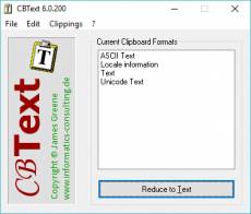 Company: Greene Informatics Consulting Country: Germany, Baden-Württemberg, Schliengen ASP member: Yes Company Web site: http://www.informatics-consulting.de Site of program: http://www.informatics-consulting.de/ Application info: http://www.informatics-consulting.ch/software/cbtext.htm#Overview Author: James Greene Sales email: greene@informatics-consulting.de Support email: greene@informatics-consulting.de License type: Shareware Class: System Utilities::Clipboard Tools Specific: Categories: Utilities :: System Utilities Platform: Windows OS: Win2000, WinXP, Win7 x32, Win7 x64, Windows 8, Windows 10, WinServer, WinOther, WinVista, WinVista x64 System requirements: Windows XP Language: English Limitations: Some features limited (fewer permanent clippings, limited formats, undo), but fully functional.