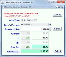Keywords: Canadian, sales tax, PST, GST, HST, Provincial sales tax, general service tax, harmonised sales tax, harmonized sales tax, gouge and screw tax, historical sales tax calculation, manufacturer's taxx Calculates Canadian sales taxes: GST HST and PST today or as they were in the past. Java Applet that can also be run as an application. Java source code and sample HTML included. This version computes by adding GST HST and PST to a base price. It also works in reverse given the final price working backwards to get the taxes and base price. In other words, it will tell you the sticker price to make something come out even after taxes are added. You can compute taxes as they were on past or future dates. It computes nickel rounding to account for the withdrawal of the penny. To install, Extract the zip download with WinZip, available from winzip.com (or similar unzip utility) into any directory you please, often C:\ -- ticking off the (user folder names) option. To run as an application, type: java.exe -jar C:\com\mindprod\canadiantax\canadiantax.jar adjusting as necessary to account for where the jar file is. You can run the program without installing it as an Applet at mindprod.com/applet/canadiantax.html There is also a Windows Jet native executable available.