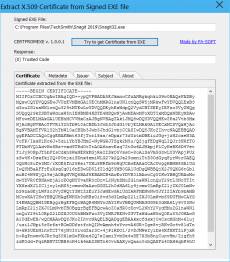 Keywords: Certificate, extract, decode, exe, encryption, issuer, security, secure This freeware program allows you to extract the X.509 Certificate from any signed EXE file (32-bit and 64-bit) which will then be automatically decoded: The Certificate text itself, the Metadata fields, the Issuer fields, the Subject fields. All decoded data can be selected with the mouse and then copied to the clipboard by clicking on the right-click context menu. The program-file (i.e. exe-file) can be loaded e.g. by drag&drop (e.g. from the Windows Start-Menu or from the desktop), or from the command-line, or with a file-open dialog. The data decoded from the Certificate can help you to verify the security of the program file. Also, the result in the 'Response' field gives you an overall security assessment of the program file. For example, the Response '(0) Trusted Code' means that everything is OK with the certificate in this program-file. Other possible responses (beside the response number) could be: 'Not Trusted Code', or 'Trust Provider Unknown', or 'Unsigned Code', or 'Error: The code has not been signed', or 'Certificate Marked as Untrusted by the User', or 'Code has been Modified', or 'Signed Code But Certificate Expired', or 'Signed Code But Certificate Chain Not Trusted', or 'Signed Code But Certificate Root Not Trusted', or 'Local Security Options Prevent Verification', etc. You can read more about X.509 certificates in this Wikipedia article: https://en.wikipedia.org/wiki/X.509 You can also read more about how program-files are signed using Certificates here in this Wikipedia article: https://en.wikipedia.org/wiki/Code_signing A program file signed by a trusted CA (Certificate Authority) gives you the assurance that the program comes from a known software vendor and that the program file has not been changed (i.e. it has not been infected by malware) since it has been signed by the software publisher. So you should always test every program downloaded from the Internet with this highly recommendable security tool CERTFROMEXE!