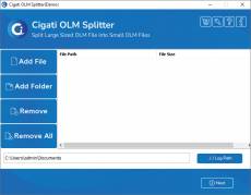 Company: Cigati Solutions Country: India, Uttar Pradesh, Noida ASP member: No Company Web site: http://www.cigatisolutions.com Site of program: http://www.cigatisolutions.com/olm-splitter/ Application info: http://www.cigatisolutions.com/olm-splitter/ Author: Cigati Solutions Sales email: admin@cigatisolutions.com Support email: admin@cigatisolutions.com License type: Shareware Class: System Utilities::File & Disk Management Specific: Categories: Utilities :: File & Disk Management, Utilities :: System Utilities Platform: Windows OS: Win2000, WinXP, Win7 x32, Win7 x64, Windows 8, Windows 10, WinServer, WinOther, WinVista, WinVista x64 System requirements: 1 GHz Processor, 512 MB RAM, Minimum 500 MB Space Language: English Limitations: Free demo version can only split the first 50 emails per folder of the OLM file.
