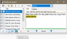Keywords: Clipboard, Text-To-Speech Speak text copied to the Clipboard from applications. Features: Add new entry for any plain text you copy from applications. New entry is automatically synthesized / spoken, even when a new entry added. Keep playing entries in listing when Continuous Play is enabled. Highlight spoken words while text is spoken, when option is enabled. Clear All, Save All entries to file via Export, and Import file (append) to add it back. Change Voice Name, Voice Rate (speed), and Voice Volume. Advanced feature: Add SSML Markup to alter the Voice for certain text in an entry. Save All entries to: a Single plain text file, a Single Audio (wav/mp3 for now) file. Use Global Keyboard Shortcuts to Play, Stop, Dis/Enable Clipboard Monitoring, etc Split Paragraphs option auto splits a long article into new entries. Some features are Limited in free.