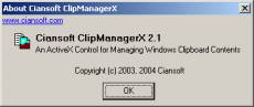 LICENCE AGREEMENT. PLEASE READ THESE TERMS AND CONDITIONS BEFORE INSTALLING THE SOFTWARE. This licence agreement applies to the Ciansoft ClipManagerX ActiveX control (Trial Version) and any accompanying files (collectively referred to as "the SOFTWARE"). By installing the SOFTWARE, you are considered to have accepted this agreement. 1. GRANT OF LICENCE. You are granted a non-exclusive licence to install and use the SOFTWARE. You must not use the SOFTWARE after the trial period of 30 days has elapsed from the first use. 2. INTELLECTUAL PROPERTY. The SOFTWARE is the intellectual property of Ciansoft. You must not disassemble the SOFTWARE or sell it to another party. You may redistribute this trial copy only in its unmodified archive form. The component files are not to be distributed separately. 3. LIABILITY. The software is supplied without warranties of any kind. Ciansoft does not accept any liabilities which may arise directly or indirectly from its use. Ciansoft, July 2009. Web site: www.ciansoft.com Email: info@ciansoft.com CIANSOFT ClipManagerX 2.1 LICENCE AGREEMENT. PLEASE READ THESE TERMS AND CONDITIONS BEFORE INSTALLING THE SOFTWARE. This licence agreement applies to the Ciansoft ClipManagerX ActiveX control and any accompanying files (collectively referred to as "the SOFTWARE"). By installing the SOFTWARE, you are considered to have accepted this agreement. 1. GRANT OF LICENCE. You are granted a non-exclusive licence to install and use the SOFTWARE for application development on a single computer. You may transfer the SOFTWARE to another computer only if you delete the previous installation. 2. INTELLECTUAL PROPERTY. The SOFTWARE is the intellectual property of Ciansoft. You must not disassemble the SOFTWARE or sell it to another party. The ActiveX file, ClipManagerX.ocx, may be distributed with your own applications. The licence file, ClipManagerX.lic, is restricted to the single installation defined by this licence agreement and must not be distributed. You may make additional copies of this file only for backup purposes. 3. LIABILITY. The software is supplied without warranties of any kind. Ciansoft does not accept any liabilities which may arise directly or indirectly from its use. Ciansoft, July 2009. Web site: www.ciansoft.com Email: info@ciansoft.com Ratio: Back Top