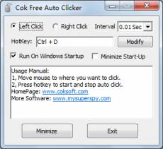Keywords: Free Auto Clicker, Auto Clicker, Free Mouse Automatic Clicker Software Cok Free Auto Clicker is a suitable completely free product which used by click computer mouse button automatically and endlessly, it could imitate both left side click and right mouse click. You should only need to fix the time periods of regular click and tap your current preset hotkey, its going to click on without delay and regularly, and planning to pause this procedure when you finally tap the hotkey again. Cok Free Auto Clicker is not a worry to operate, You can learn to operate the program after 1 minute. Ways to use Cok Free Auto Clicker 1. Fix simulate mouse click: left mouse click and also right mouse click; 2. Define period length of click; 3. Set start&finish hotkey, default is usually Ctrl + D, you can easily modify it to your value that you just like. 4. Fix auto start. When you tick this selection on, software will open quickly anytime computer system start. 5. Set auto minimise to tray icon. Once this computer software launch, it can be minimise to tray icon without your help. Features of Cok Free Auto Clicker Although Cok free auto clicker is free of charge program, all of us worked for high quality while developed it. Comparing with a numbers of different kinds of computer program that similar to ours, It has a lot of remarkable positive aspects as below: 1. All set features can be saved. Kind of mouse click, time period interval and hotkey for which you fix can always be saved fully, when you operate this software the next occasion, it can use the parameters which being exercised before. A majority of other competing program don't have this attribute, cause it to really troublesome and time-wasting to put parameter all over again. 2. It could automatic launch the instant pc start-up. Automatic click program is a specifically additional program, it can be really difficult if the application can't auto launch. Any time you don't need this software start automatically, you can specify this software to never automatic initiate too.