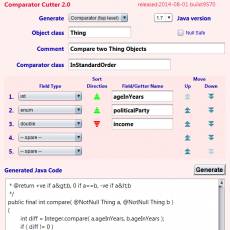 Company: Canadian Mind Products Country: Canada, BC, Victoria ASP member: Yes Company Web site: http://mindprod.com Site of program: http://mindprod.com/products.html Application info: http://mindprod.com/applet/comparatorcutter.html Author: Roedy Green Sales email: inquiry@mindprod.com Support email: inquiry@mindprod.com License type: Freeware Class: Web Development::Java & JavaScript Specific: Development Tools Categories: Programming :: Java, Programming :: Source Code, Programming :: Source code generator Platform: Windows OS: Win2000, WinXP, Win7 x32, Win7 x64, Windows 8, Windows 10, WinServer, WinOther, WinVista, WinVista x64 System requirements: Java 1.8+ Language: English Limitations: No limitations.