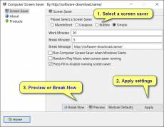 'computer screensaver' includes 4 screensavers. 'computer screensaver' is compiled of the customizable features that can be configured to set the work time, break time and even set your favorite music to be played. Press F8 to disable a running screensaver.