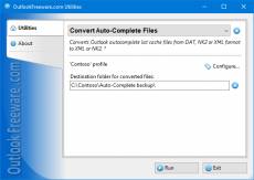 Keywords: free, freeware, outlook, add-in, add-on, autocomplete, convert Free, easy and fast way to convert Microsoft Outlook auto-complete list cache files from NK2, DAT and XML to XML and NK2 formats. Automatically detects autocomplete cache files used by Outlook and allows you to specify custom location for these files. This tool can be utilized to transfer, migrate, backup and edit Outlook auto-complete lists. Binary NK2 files is a convenient way to transfer or migrate while the XML text files are easy to backup and edit in any text editor. For your convenience Outlook add-in allowing to run the tool right from Outlook and standalone launcher application allowing to run the tool without the need to start Outlook are included in the product.