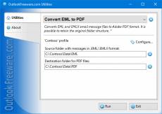 Keywords: free, freeware, outlook, add-in, add-on, eml, pdf, convert This free utility converts EML and EMLX email message files to Adobe PDF format. Saves emails to PDF and attachments, original formatting, and source folder structure. Allows batch upload of multiple EML files. - Convert and print EML emails to PDF with no data loss. Save attachments, links, subject, addresses of senders and recipients, dates, and original formatting. - Change the format of the emails while maintaining folder structure. - Save a large number of .eml files to PDF at once. - Convert EML files to PDF without launching email applications. - Store your email archives in a universal format. - Send archived emails to any user regardless of the email client and platform. Key benefits of the utility: 1. Saves emails to individual PDF files, one PDF for each EML file, keeping the original folder structure. 2. You can choose where to save message attachments. Add them directly to the PDF file, or save attachments in a separate folder. Here, the message header contains links to the saved files. 3. Saves sender and recipient addresses from emails to PDF files, including CC and BCC. 4. Page Setup option allows the user to print emails to PDF documents customized to the required page size 5. Safely converts EML files to PDF, automatically renaming or skipping existing ones. 6. Provides a command-line app that you can use to batch convert EML to PDF. 7. Converts emails to PDF along with links. Maintains data integrity. 8. Supports EMLX format. Our EML to PDF converter does not require you to import EML files into your email client. After setup and launch, all work will be done automatically, no matter how many EML files you need to convert. Some of the described features available in the advanced version of the utility only.