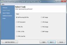Keywords: powerpoint, export, convert, exe, self running Use Convert PPT for PowerPoint to convert presentations (.ppt, .pps, .pptx, .ppsx) to self-running exe file or gif, jpg, png, bmp, rtf, html files. Convert PowerPoint files to exe file that can be used to preview presentations on PCs that does not have PowerPoint installed. Use the exe file as a self-running tutorial for your products or services. Main Benefits: Easy to use for beginners, powerful for advanced users. Generated exe file can run on a PC that does not have PowerPoint installed. Can change generated exe file icon. Can add music to your exe presentations. Change slides on mouse click or automatically. Works with latest PowerPoint 2013 and older Outlook 2010, 2007 and 2003 (both 32 and 64 bit versions).