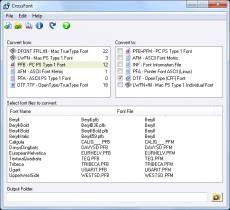 Keywords: CrossFont, convert, converter, OpenType, TrueType, PostScript, Type1, OTF, PFB, TTF, PFM, AFM, font, fonts, Macintosh, typeface, dfont, crossplatform, kerning CrossFont for Windows can convert TrueType and PostScript Type1 fonts between Macintosh and PC platforms and convert Type 1 to OpenType (CFF .otf). Features include Zip archive support. Modify menu related names in TrueType and OpenType fonts. Automatic search of folders, subfolders and archives for supported file types. Drag and drop font files, folders and archives onto main window for easy conversion. Preview fonts and modify preview text. Character outlines, metrics and hinting are preserved for like outline formats. Generate missing supporting font files (AFM, PFM, INF, PFA, etc.). Support for OS X data fork fonts (.dfont) and resource fork fonts. Automatically extract kerning from external files.