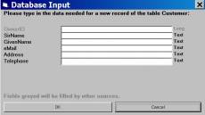 Keywords: Access, Database, delete, add, sort, select, input, form, types, ActriveX The ActiveX Element displays a form to get user input for all fields of a table to create a new database entry. The database is Microsoft Access 98. Further more in connection with a Database object, a Data object and a MSFlexGrid object the operations delete, sort, select and change are provided. So you can easily address a Access database, the fill in form with respective fields comes by this ActiveX.
