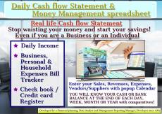 Keywords: Cash flow statement spreadsheet, Daily cash flow statement, Cash flow, Personal Cash flow Statement, Daily Sales tracker, Expense manager, Check book Register, Bill Tracker, Household Expense Tracker, Personal Expense Tracker, Family budget planner