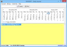 Company: VOVSOFT Country: Turkey, Turkey, Istanbul ASP member: No Company Web site: https://vovsoft.com Site of program: http://vovsoft.com/ Application info: https://vovsoft.com/software/daily-journal/ Video: https://www.youtube.com/watch?v=8RzIonG5Z24 Author: VOV SOFT Sales email: vov@vovsoft.com Support email: vov@vovsoft.com License type: Shareware Class: Business::PIMS & Calendars Specific: Utilities Categories: Home & Hobby :: Calendars & Planners, Home & Hobby :: Journals & Diaries Platform: Windows OS: Win2000, WinXP, Win7 x32, Win7 x64, Windows 8, Windows 10, WinServer, WinOther, WinVista, WinVista x64 System requirements: Windows XP or later. Language: English Limitations: Nag screen.