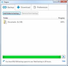 Keywords: free, backup, cloud, online, storage, p2p, secure, reliable, simple, photo, documents 100 GB free secure cloud backup! Never lose a photo or important file again. Degoo's secure cloud storage makes sure you can always download your backed up files when you need them. Degoo is very easy to use. The only thing you have to do is select the folders you want to backup. You can add, edit or remove files in you backed up folders. Degoo will detect any changes and backup your files automatically. You can turn of your computer in the middle of a backup as Degoo will resume your backup when your computer is switched on again.