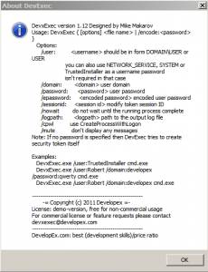 Keywords: run as, runas, run under credentials, user credentials, run under different user, runas another user, run process, run process as user, runas command line, run under another user account, runas another account Because of security reasons creating a new process from Windows service isn't a simple task especially if you need to run an application with GUI on Windows 2008/Windows Vista/Windows 7 under specific user account. DevxExec is designed exactly to run application from a windows service. Using DevxExec you can run applications from your service under Local System, Network Service or a specific user account. There is even possibility to specify a session for the running application. Thus when multiple users connected to the computer via remote desktop you can specify on which desktop the application should be started. It has command line interface. To see the help, run DevxExec with no parameters. DevxExec is free for noncommercial usage. DevxExec.exe /user: Administrator /password:qwerty cmd.exe This command automatically grant to user Administrator permissions on the appropriate window station and the desktop and run a command shell. Let's consider following scenario. You have a Windows service running. User John Doe has logged to the computer. And you want your service to start the application that will be shown to John Doe on his current desktop. In other words, you need to run a new process in another session. Again you can use DevxExec. It has a special parameter /sessionid to specify the session you what to run a new process in. For example this command could start a command shell for a logged in user under Administrator. DevxExec.exe /user: Marcus /password:qwerty /sessionid:1 cmd.exe Devxexec is the tool the allowing running processes under different user accounts without knowing the password. It is even possible to run a process under domain account without specifying its password! You can use Devxexec to run a process under SYSTEM, NETWORK_SERVICE, TrustedInstaller in an interactive session.