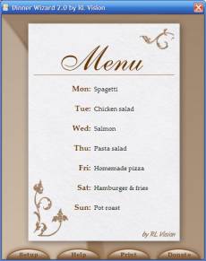 Keywords: dinner, lunch, food, menu, create, generate, inspiration, make, dishes, meals Figuring out what to eat to dinner each night is not an easy thing to do 365 days a year. That's why Dinner Wizard was created. This free program will assist you by suggesting a weekly menu based on your preferences. It's very easy to use and the result is a nice looking menu that you can use for inspiration (or follow stricly if you want to). Features * Create new menus with a single click * Dishes are randomly chosen * Setup the food to suit your taste * Use for inspiration and ideas * Print your personal menu * Freeware!