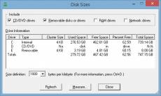 Keywords: disk, drive, folder, file, cluster, size, allocation unit, space DiskSizes 2.0 shows status information about your computer's disks or drives. This information includes drive type, cluster size, used space, free space, percent free, total space, and drive totals. You can select including CD/DVD, removable, RAM (Random Access Memory) and network drives. Files are stored in an integral number of clusters (or allocation units). Disk sizes may be based on powers of 1000 or 1024. When 1000 is selected, a megabyte is a million bytes, a gigabyte is a billion bytes and a terabyte is a trillion bytes. It can also measure a folder's disk use and display the number of subfolders, number of files, sum of the file sizes and total disk use. Hidden and system files may be included or excluded. Total disk use may be relative to the cluster size on any of your computer's drives that has a disk in it. It may also be relative to a selected size or all of the listed sizes. In the last case, this information may be exported to a text file and is useful for determining the range of disk use for a program or other file set. This information may also be useful when you are planning to store or copy many files. DiskSizes requires Windows 98 or Windows NT 4.0 or later and does not contain any adware or spyware. The one-time fee is $4.99.
