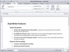 Keywords: word processor, speech recognition Dual Writer is a word processor for Microsoft Windows that incorporates Speech Recognition technology to make you more productive. Now you can use the keyboard and mouse - and a microphone - to type and talk your documents. Your speech is converted to text and placed directly into the document. The Speech Feedback Window in Dual Writer shows you the text that was entered into the document. You can use speech to dictate document content, or to give commands to navigate through the document, and select, edit and format text - all by voice command. Whether you write for papers for school or reports for work, Dual Writer makes writing more fun - so you get more done. Writer's block? No problem. Just start talking. It's a completely different experience from typing. Dual Writer takes the drudgery out of writing the first draft of a report. It's perfect for getting all your ideas on paper. Typing is work. Talking is natural. Now you can do all your transcription work in one software program - Dual Writer. Dual Writer gives you everything you need in one application to transcribe your audio and video files. It provides a full featured word processor, speech recognition and built-in media player. It's all there. Click the Transcribe button to open the Transcription panel inside the Dual Writer document window. It's built-in. Click the Open button to select a media file and you're ready to get to work. You can type the text of your transcription file, or use speech recognition to dictate what you hear. Dual Writer's transcription features are easy and intuitive to use, and take only a few minutes to learn. You'll be transcribing at full speed after just one session. Try out Dual Writer and experience word processing powered by speech. It's easy to get started. All you need is microphone. No additional software is required.