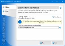 Company: Relief Software Country: United States of America, TX, Houston ASP member: No Company Web site: http://www.outlookfreeware.com Site of program: http://www.outlookfreeware.com Application info: http://www.outlookfreeware.com/en/products/all/outlookautocompleteexport Author: Outlook Freeware Sales email: info@outlookfreeware.com Support email: info@outlookfreeware.com License type: Freeware Class: Communications::Other E-Mail Tools Specific: Internet Categories: Outlook add-ins, Outlook addins, Outlook addons, Outlook Add-ons, Microsoft Email Add-ins, Office add-ins, E-Mail add-ins, E-Mail addins, E-Mail add-ons, E-Mail addons, E-Mail Tools, E Mail Tools, Mail Tools, Mail Utilities, Email, Работа с почтой, Почта, Email-Software, Internet & Network, Internet, Интернет, Outlook, E-Mail, Email - Miscellaneous, Communications, Интернет & сеть Platform: Windows OS: Win2000, WinXP, Win7 x32, Win7 x64, Windows 8, Windows 10, WinServer, WinOther, WinVista, WinVista x64 System requirements: Microsoft Office Outlook 365/2021/2019/2016/2013/2010/2007 Language: English, Russian Limitations:
