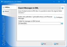 Keywords: free, freeware, outlook, add-in, add-on, export, eml, backup, messages Free and easy way to export messages from specified Outlook folders to EML format files. It is possible to retain the original folder structure. Microsoft Outlook cannot export messages preserving source folder structure. This utility allows solving this problem. Specify target folder for files in EML format, source Outlook folder(s) and run the utility. You will get all your exported messages placed according to the source folder structure. This utility can also be used to export messages to Windows Live Mail, Mozilla Thunderbird and other email clients that recognize emails files in EML format. The product provides both standalone application and Outlook add-in.
