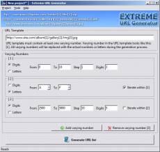 Keywords: url, address, http, internet, generator, creator, software, tool, utility, save Extreme URL Generator is an easy way to generate and save a list of similar URLs. It provides clean and intuitive user interface that lets you generate hundreds and thousands of URLs with just a few mouse clicks. After the URL list is generated you can save it into a text file or copy it into the Windows clipboard with another mouse click. But this is not all! Extreme URL Generator provides you with many options when you save the generated list of URLs into a text file. You can add prefix and suffix to every URL, save the entire list as a single line or make each URL occupy its own line in the file. So the saved file is immediately usable by many other programs.