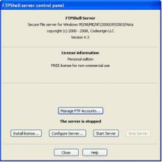 Company: FTPshell Software Country: United States of America, New Hampshire, Nashua ASP member: Yes Company Web site: http://www.ftpshell.com Site of program: http://www.ftpshell.com/server/ Application info: http://www.ftpshell.com/server/index.htm Author: John Johnson Sales email: ftpshell4@ftpshell.com Support email: ftpshell4@ftpshell.com License type: Shareware Class: Servers::FTP Servers Specific: Internet Categories: Internet :: FTP, Internet :: File Sharing Tools, Internet :: Tools & Utilities, Internet :: Miscellaneous, Utilities :: IS/IT Solutions, Utilities :: Miscellaneous Platform: OS: WinOther, Win98, Win2000, WinXP, Win7 x32, Win7 x64, Windows 8, WinServer, WinVista, WinVista x64 System requirements: Windows 2000/XP/2003/Vista/7/2008/8/2012 Language: English Limitations: No limitations