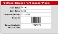 Keywords: FileMaker, barcode, plugin, plug-in, bar, code, code128, code39 The FileMaker Pro Barcode Plug-In for Windows and Macintosh easily integrates into forms and reports to add barcodes. Code 128 (sets A, B, and C), Postnet, Planet, GS1 DataBar, Interleaved 2 of 5, ITF, UPC-A, EAN-13, EAN-8, Codabar and MSI are supported. This barcode plug-in is free to use it with one of IDAutomation's barcode fonts. The fonts are available at https://www.idautomation.com/barcode-fonts/. An online tutorial covers barcode fonts, plug-ins, and extensions for FileMaker versions 4 and higher on Windows and Macintosh systems, including Windows 8 and Filemaker Pro 13 at https://www.idautomation.com/font-encoders/filemaker/. Introducing a new FileMaker Pro 2D Barcode Plug-in that has been released for Data Matrix, PDF417, and QR-Code symbologies. Compatible for FileMaker Pro Versions 8.5 and above, create 2D barcodes in reports by pulling data from databases, or have data change dynamically when adding new records without the use of scripts. This FileMaker Plugin is included in each of the separate Data Matrix, PDF417, and QR-Code packages. More information can be found at https://www.idautomation.com/font-encoders/filemaker/#2D_Barcodes:_DataMatrix,_PDF417_or_QR-Code.