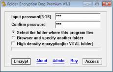 Keywords: Folder Encryption, access control, encryption utility, password protect [Folder Encryption Dog Premium] is a Folders' data access control and encryption utility designed for Windows 98/Me/2000/XP/Win 7. It lets you password protect, hide, and encrypt data of folders in hard disk or portable disk. Without password, nobody is able to delete, move or copy the files in protected folders. Simple-to-use: Copy the soft to the folder being protected, input password,push the button "Encrypt",that is OK! What happens as follows: * Everything in the protected folder disappears except for the soft. * The protected folder can not be deleted, moved or copied. Main features include: **It is a green software, needs not to be installed! **Support to encrypt/decrypt a batch of folders once. * Make any number of files and folders not accessible and invisible. * Protect folders in hard disk or portable disk * Support FAT/FAT32/NTFS * Support registration to removable USB disk or fixed hard disk