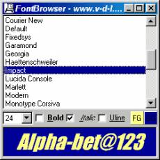 Keywords: font, browse, preview, browser, explore, explorer, fontbrowser, face, type, navigate, navigator, fontnavigator, free, automatic, freeware, speed, multiple, internet, applications, apps, appz, cheap, com, download, downloadz, easy, 95, good, gratis, gratuit, hacks, hackz, high, huge FontBrowser is a small program which enables you to preview all the fonts available on your system at various sizes, colors and styles. The interface is clear and simple. The preview can be resized by dragging at the border just below the font list. The window as a whole can be resized too. Fonts can be selected by simply clicking in a list, which can also be quickly browsed by using the cursor, page up/down and home/end keys. Any combination bold, italic and underline styles can be selected and the color of both the background and foreground of the preview can be chosen. By clicking on the preview text, a window pops up allowing you to change the text used in the preview, allowing you to preview the precise text you'll be needing the font for. FontBrowser stores the last used settings automatically and uses them when starting again at a later time. FontBrowser can be used immediately after downloading, no installation or configuration required. The program has been compressed as an executable and is as small a download as possible without using any installer or archive (like zip files).