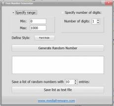 The free number generator is one of the most useful software applications that generate a random number with specific characteristics. This free software application can be used in different situations for various purposes. Random number generator finds its application in various areas which require an unpredictable result such as computer simulation, gambling, cryptography and randomized designs. The font style of this software program can be altered according to the desires of the users. The users can also program the app to generate a number based on the number of digits. The software program also provides options wherein the users can specify a range for a number to be generated. Another excellent feature of the Free Number Generator app is that the users can save a list of random numbers in a single line format in a text file. This free software app features excellent performance and high speed. It also exhibits excellent functionality and it is an ideal choice for users who work with random numbers. The free number generator features a simplistic application and therefore it is quite easy to use. High speed random number generation is another important feature of the Free Number Generator software application. The random numbers are generated on the basis of the number of digits or interval definition. The software application allows the generation of a list of random numbers according to the number of records. It can then be saved to a txt file. This free application also allows the users to change the color and style of the fonts used in the program. Apart from the simplicity of usage, the Free Number Generator program is compatible with all versions of Microsoft Windows.