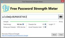 Keywords: password strength meter, free password strength meter, password strength checker, free password strength checker, check password, secure password, strong password, safe passwords, password tools, password strength, password check Free Password Strength Meter checks the level of strength of your passwords. It uses information entropy as a measure of strength and reliability. Free Password Strength Meter checks and displays the strength of your passwords, in bits of entropy. It also shows you the level of password strength using a scale of levels: very weak, weak, reasonable, good, strong and very strong password. It is recommended to use only passwords with a strong and a very strong level of strength. Those passwords are unpredictable and complex enough to effectively resist guessing and brute-force attacks. Check your passwords with Free Password Strength Meter and use only strong and secure passwords to protect your privacy. Free Password Strength Meter is a freeware product. It works on Windows 10, Windows 8, Windows 8.1, Windows 7, Windows XP and Windows Vista.