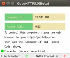 Keywords: Online Remote control, desktop share, screen capture, file transfer, linux GotoHTTP is a online remote control tool. No matter where you are, use a web browser to control your remote work computer. Work from anywhere. It is also the smallest and easiest to use remote control software, it uses secure connection and can penetrate any firewall. User only needs to download the GotoHTTP software to the computer which is about to be controlled. GotoHTTP for Linux is only about 3M. On controlling side, user is not required to download any additional software or plugin. It uses web browser to control remote computer and transfer files, and allows multi-users to control one computer. So you can share the screen for presentation. The download link is for 64Bit Linux, please go to official website (gotohttp.com) to download 32bit edition. 1. Access from anywhere. Use a web browser to control remote computer without installing any software or plugin. 2. Cross-platform. Control remote computer from Mobile device, Windows, MAC, Linux... 3. Mouse middle button supported for Linux selection and paste. 4. Soft keyboard support. User can send any keys to remote computer. 5. Clipboard synchronization. 6. Manage remote files, and transfer files between local and remote computer. 7. Full screen view mode, fit in window and actual size view mode. Auto scroll following the mouse if remote desktop is larger than local view. 8. Mouse wheel support. 9. Self-adaptive on remote resolution changed 10. Unattended Access