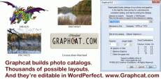 Keywords: corel wordperfect, photo album, camera, catalog clip art, jpg, wpg, gif, png, dtp, desktop publishing Graphcat Clip Art and Photograph Cataloger, version 6.70 Builds clip art and digital photo catalogs and albums in Corel WordPerfect 10 to 2020 for Windows. Version 6.70 adds support for Corel WordPerfect 2021 and Windows 10, supports WordPerfect versions 10-12, X3 to X9, 2021 and 2020. Reads all graphics formats supported by WordPerfect, and sets up images in columns as a printed index. User may select number of columns, image height, page title, wild-card file masks, and directory to search. Allows partial catalogs, directory searching, and caption autosizing. Includes paper size selection, extension hiding options. Winner, Business Applications Division for 3rd Party Products in the Corel $3,000,000 World Design Contest. Includes sample Wood Clips WPG images, and purchasers receive over 1,000 additional Wood Clips. Free Trial, $20 to buy online at www.graphcat.com.