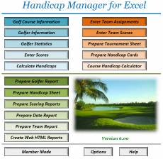 Keywords: Golf, Handicap, Handicapping, Sports, Excel, Spreadsheet, Statistics, Golfers, League Handicap Manager for Excel is a custom application written with Visual Basic for Applications in Microsoft Excel. It is completely compatible with Excel 97/2000/XP/2003/2007/2010/2013 or higher. It meets all the requirements of the USGA Handicap System for the computation of USGA Handicap Indexes. It can also be used to compute scoring averages, track team scores, track statistics, league handicaps and custom handicaps based on user-defined parameters. Its user friendly interface and point and click simplicity make it easy to learn even for computer novices. Whether you are maintaining USGA Handicap Indexes for all the members of a golf club or just tracking your own scores, Handicap Manager for Excel provides an easy solution.