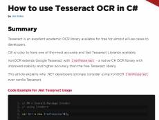 Company: Jim Baker and Iron Tesseract OCR Team Country: United States of America, Colorado, Aurora ASP member: No Company Web site: https://ironsoftware.com/csharp/ocr/tutorials/c-sharp-tesseract-ocr/ Site of program: https://ironsoftware.com/csharp/ocr/tutorials/c-sharp-tesseract-ocr/ Application info: https://ironsoftware.com/csharp/ocr/tutorials/c-sharp-tesseract-ocr/ Author: Jim Baker Sales email: tesseractocr.pad@submitpad.org Support email: tesseractocr.pad@submitpad.org License type: Shareware Class: Development::C / C++ / C# Specific: Categories: Business & Finance :: Accounting Tools, Business & Finance :: Database Managers, Business & Finance :: Invoice & billing, Business & Finance :: Office Tools, Business & Finance :: Presentation Tools, Business & Finance :: Project Management, Business & Finance :: Finance Tools, Business & Finance :: Word Processing, Business & Finance :: Utilities, Business & Finance :: Misc. Business, Communication :: Misc. Communication, Internet :: Browser Utilities, Internet :: Promotion, Internet :: Miscellaneous, Internet :: Tools & Utilities, Programming :: C & C++ & C#, Programming :: .NET, Programming :: Management and Distribution, Programming :: Source Code, Programming :: Tools and Editors, Programming :: Miscellaneous, Programming :: Visual Basic, Utilities :: System Utilities, Utilities :: Miscellaneous, Web Development :: ASP, Web Development :: HTML Conversion Tools, Web Development :: Reference & Tutorials, Web Development :: Web Design Utilities, Web Development :: Miscellaneous Platform: Windows OS: Win2000, WinXP, Win7 x32, Win7 x64, Windows 8, Windows 10, WinServer, WinOther, WinVista, WinVista x64 System requirements: Requires Windows, Linux (Denbian, Ubuntu, or CentOS system architecture. Supports C# or VB .NET Language: English, Arabic, Chinese, ChineseSimplified, ChineseTraditional, Danish, Dutch, French, German, Greek, Hebrew, Italian, Japanese, Korean, Portuguese, Russian, Spanish, Swedish, Thai Limitations: Free for development on any number of machines or servers. Licensing required for deployment to a live project environment.