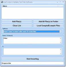 Keywords: inserting, insertion, line, txt, first, 1st, last, 2nd, second, into, inside, within, at the position of, location of, at, middle, the, page, document, file, new, existing, how to, add, adding, putting, put, place, certain, writing, write, placing This software offers a solution to users who want to insert lines into one or more text files. The user simply chooses the required files or an entire folder before starting the insertion. Then, using a drop down menu, the user selects the option to insert the lines: as first line, last line or before or after each occurrence of a user specified character or string of characters. This software can be useful when addition of standard clause or text phrase is needed in multiple documents. For example: 'subject to local taxes' could be inserted next to prices of products.