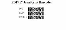 Keywords: pdf417 javascript, pdf417 html 5, javascript barcode pdf417, html 5 barcode pdf417 The PDF417 JavaScript Barcode Generator embeds directly into a JavaScript-enabled environment or web page to display static or dynamic data in PDF417 barcode image formats. A Single native JavaScript file may be used to generate barcode images in a variety of formats including SVG and HTML 5. Other features include: -Supports standards and specifications based on the PDF417 barcode symbology. -May be used with JQuery, and supports optional HTML Element ID references. -Supports image types for SVG, HTML 5 Canvas, BMP and Font Image. -Includes advanced support for ASCII functions, GS1, ISBT and HIBC with tilde options. -Compressed and uncompressed source code provided. The JavaScript Barcode Generator is available in several versions and license types to meet any usage scenario. This is the PDF417 version which supports standards based on the PDF417 symbology. Other versions support invididual barcode types for Intelligent Mail, USPS, UPC/EAN, DataBar, Data Matrix, Code 128 and QR Code, as well as versions that support all linear barcode types, and all linear and 2D barcode types. Each version is available in license options for single or multiple developers with distribution rights that vary.